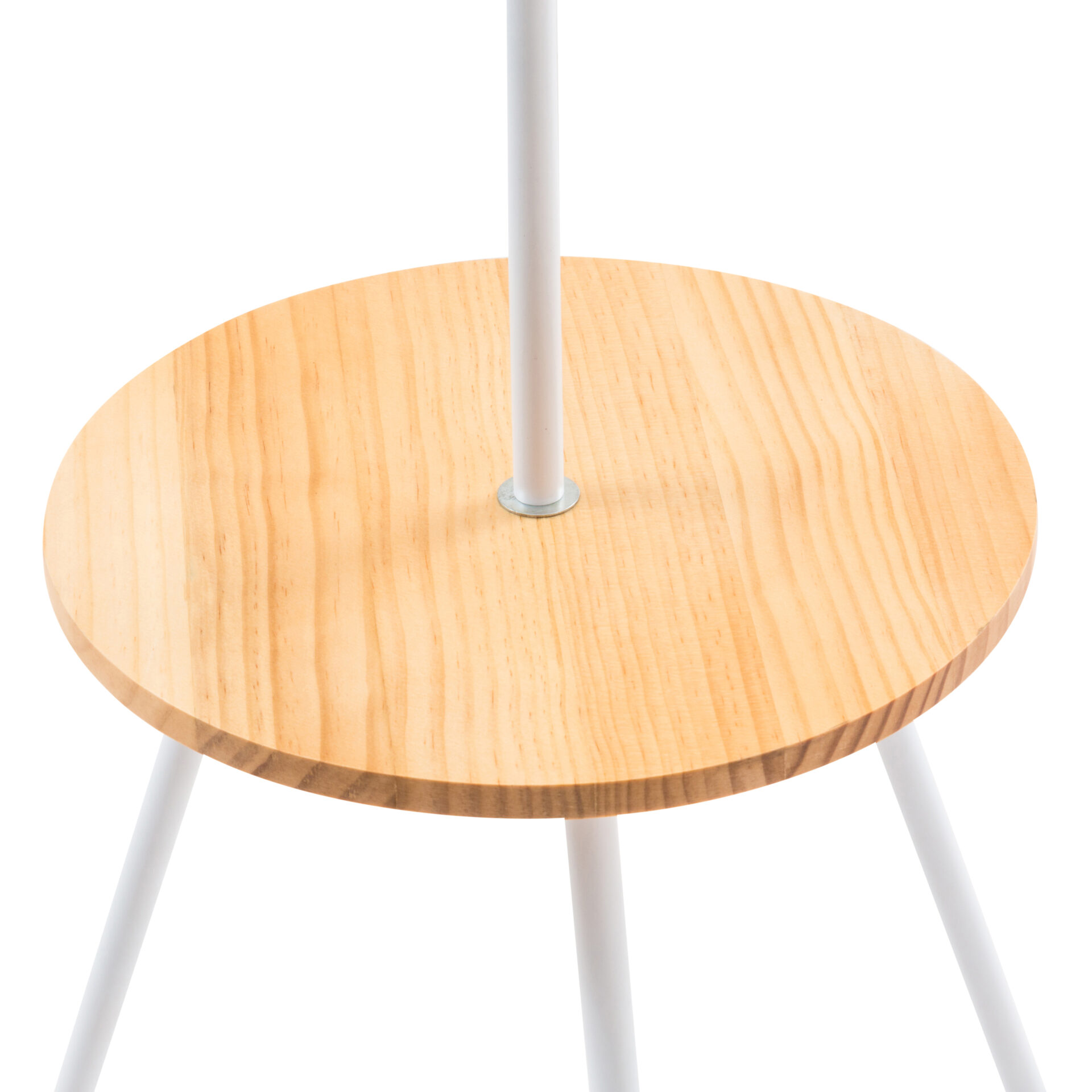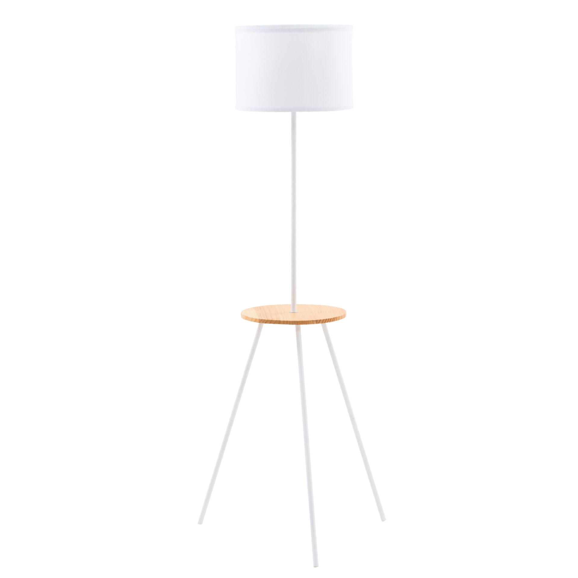 Lampada da terra dal design scandinavo, tre sottili aste, in metallo verniciato bianco, sorreggono un tavolino in legno, dal quale si dirama il corpo della lampada sormontato da un paralume in tessuto bianco che consente una perfetta diffusione della luce. Lampada versatile e d’arredo è ideale per ambienti come salotti, open space o living.